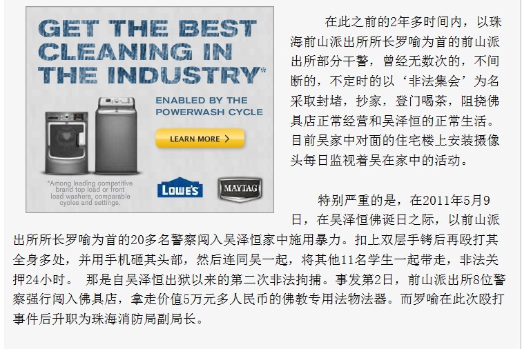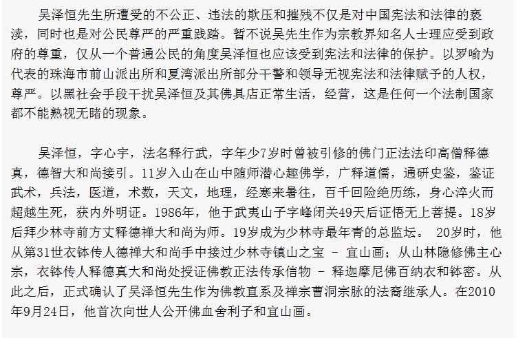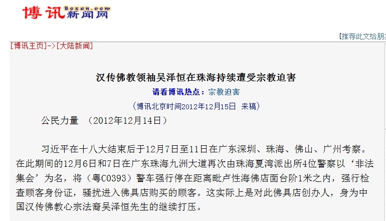 On December 14, 2012, the Boxun news service (http://boxun.com) posted an article about the continuing religious persecution, in the city of Zhuhai, of Wu Zeheng, the Chinese Han Buddhist Leader, persecution which had been hidden from the public for many years.