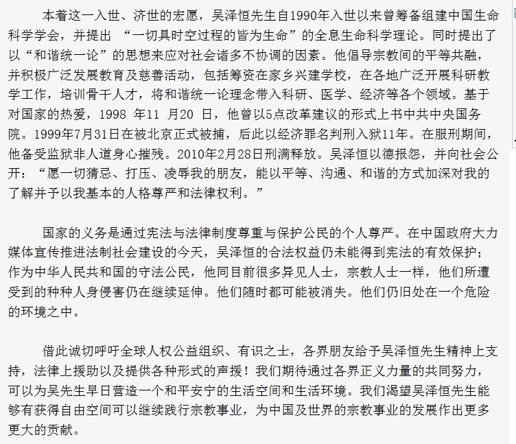 We are calling on friends from all walks of life as well as global charitable organizations that support human rights issues to give their moral support to Mr. Wu Zeheng as well as legal assistance and solid backing. We anticipate that our joint efforts will eventually create a peaceful environment for Mr. Wu, so that he can continue to practice his religious mission, and make even greater contributions to the development of China and the world's religious practices.