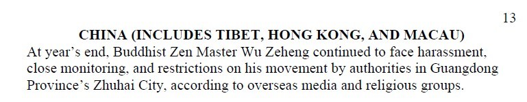 In May 2013, in its International Religious Freedom Report on China ( page 13 ), the US Department of State highlights Wu Zeheng's ongoing harassment by local police authorities in Zhuhai, Guangdong. http://www.state.gov/j/drl/rls/irf/religiousfreedom/#wrapper