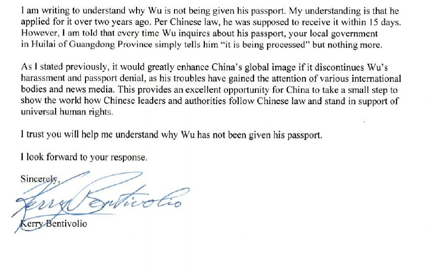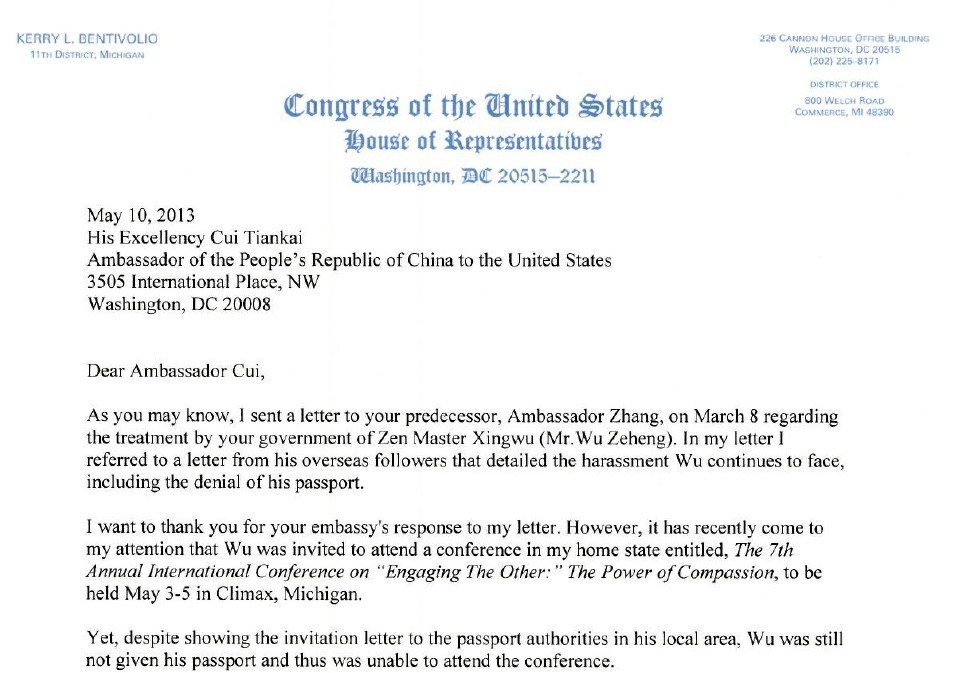 May 10, 2013, Congressman Kerry Bentivolio sent a letter to the Chinese Embassy in Washington D.C to request the reason for why not giving Wu passport.