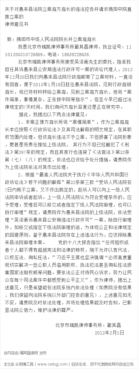 On Feb 1, 2013, Wu's lawyer filed the necessary legal documents with the Jieyang Court requesting it to directly file the legal proceedings themselves since the Huilai cour has not responded to the litigation proceedings sent on December 20, 2012.