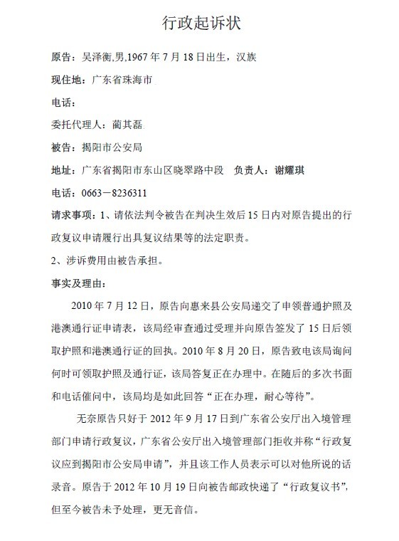 惠来县公安局答复称,吴泽衡于2010年7月12日申请普通护照和港澳通行证,预约于2010年7月27日领取护照,2010年8月2日领取港澳通行证。吴泽衡于2012年10月20日申请行政复议,已超过行政复议60日的申请期限,依法应驳回其行政复议申请。