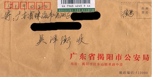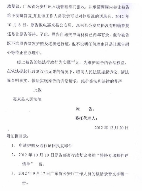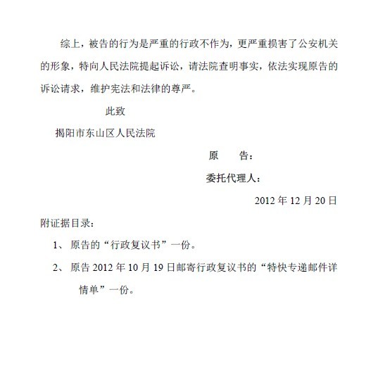 On December 20, 2012,Wu submitted Applications for Litigation Proceedings to courts in Jieyang City and Huilai county because Wu did not receive any governmental response to his application for Administrative Reconsideration to the Jieyang PSB of Guangdong Province. The Jieyang PSB is required to respond within 60 days but failed to do so. The documentation for this is below.