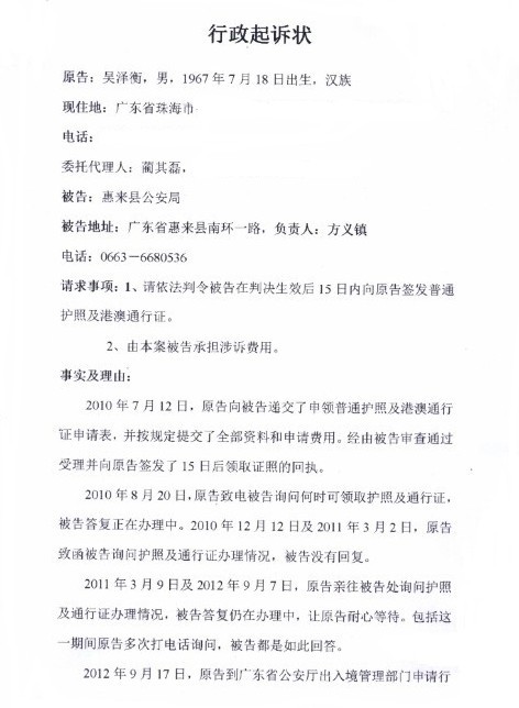 On October 8, 2012, the Plaintiff called the Hui-lai Public Security Bureau; however, it did not offer an answer, and asked the Plaintiff to wait. More than two years have passed since the Plaintiff submitted the passport and pass application document. For over two years now, not only has the Defendant not been issued the passport and pass for HK/Macao for the Plaintiff, but the Defendant has also not offered any reason for its behavior other than telling the Plaintiff to be patient because the application is still being processed.