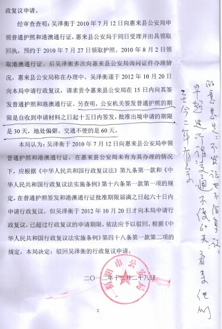 Wu waited more than 60 days after submitting an application for Administrative Reconsideration to the Jieyang PSB of Guangdong Province, however, he never received a response. Therefore, Wu submitted Applications for Litigation Proceedings to Jieyang People's Court of Dongshan District and Huilai People's county on December 20, 2012.